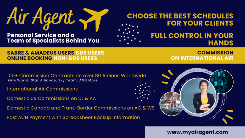 Welcome to Air Agent, a dedicated division of WorldTravelService with a rich legacy dating back to 1985. Catering to both leisure and corporate international travelers, our focus is on air travel solutions, specifically tailored to assist travel agents in efficiently managing their clients’ international air schedules while maximizing revenue. At Air Agent, we understand the intricacies involved in crafting custom experiences or packages that include international air travel. Whether you prefer utilizing your own GDS booking tool or exploring the capabilities of our user-friendly online platform, we provide you with the tools and support needed to take full control of your travel planning process. Empower your travel agency to reach new heights by partnering with Air Agent today. Elevate your service offerings and unlock new revenue streams by registering at www.myairagent.com. Join us in revolutionizing the way travel agents approach international air travel arrangements. Give us a try and see how we do it!